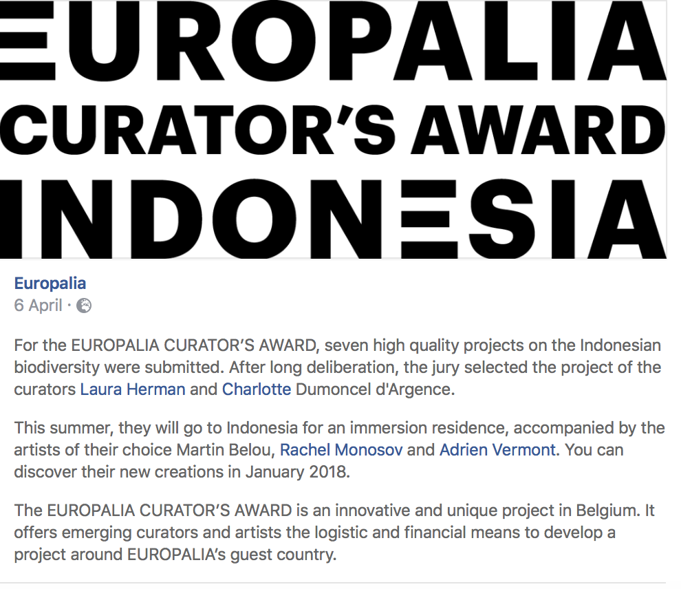 Europalia Curator’s Award (Selected Artist), Belgium; Curators: Laura Herman & Charlotte Dumoncel d’Argence
