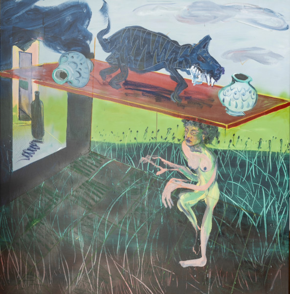 Beware of the Monster, 2023 acrylic & oil pastels on canvas, 150 × 150 cm